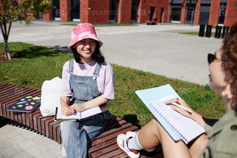 Молодая азиатская женщина учится с другом на открытом воздухе в кампусе колледжа и улыбается