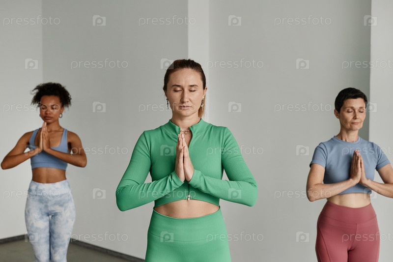 Три женщины медитируют с закрытыми глазами в студии йоги