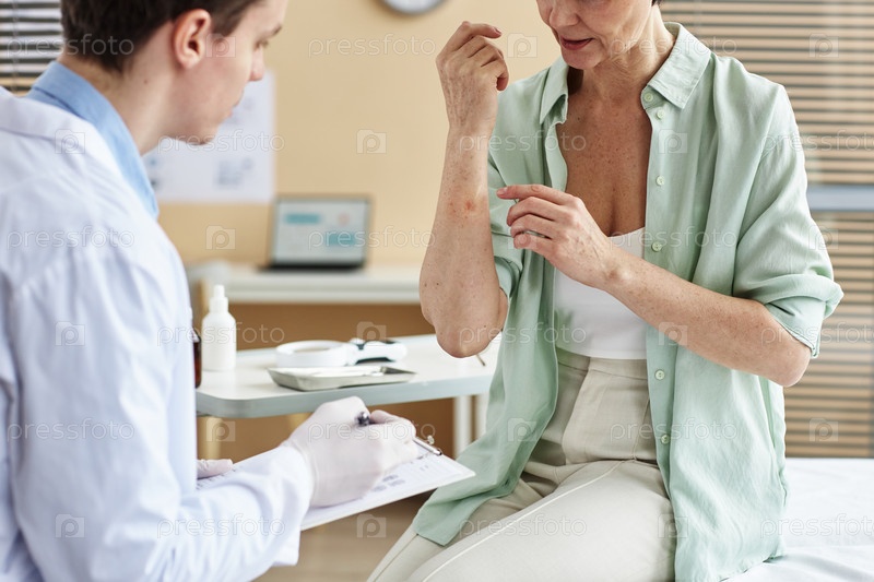Близкий план зрелой женщины, объясняющей симптомы заболевания кожи