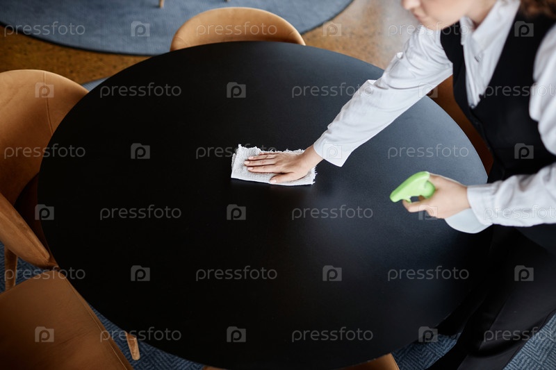 Вид сверху молодая женщина, стирающая круглый обеденный стол уборка в ресторане