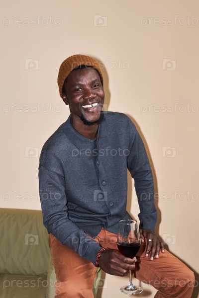 Улыбающийся молодой чернокожий мужчина с красным вином сидит на диване, улыбаясь камере