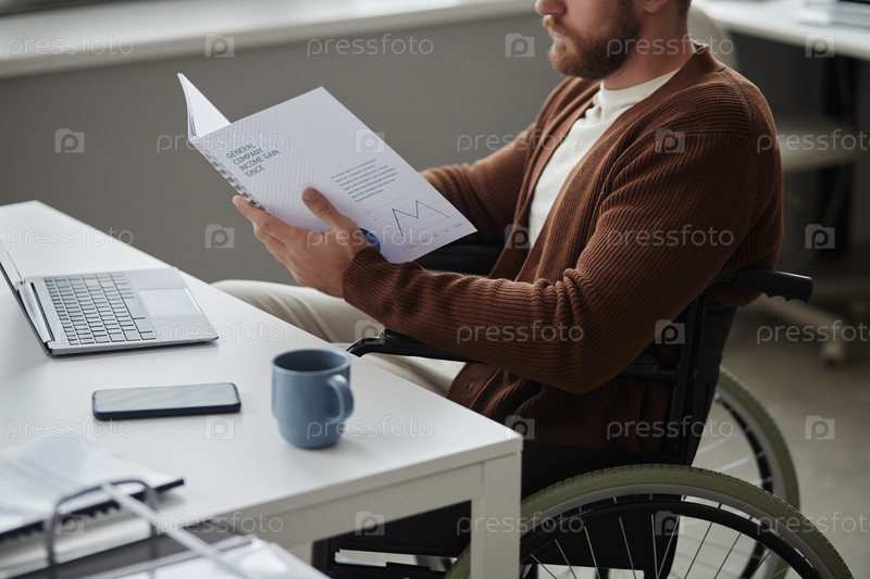 Человек с инвалидностью, работающий в офисе и читающий документы