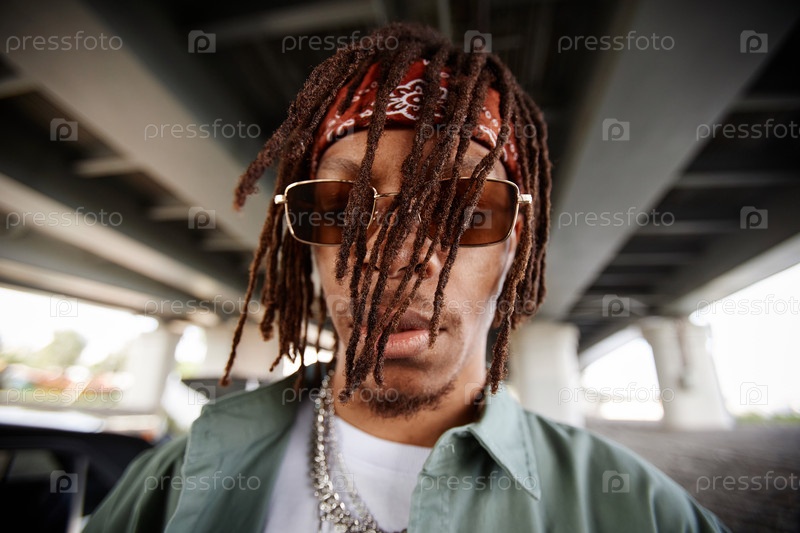 Молодой афроамериканский исполнитель хип-хопа в солнцезащитных очках смотрит на камеру