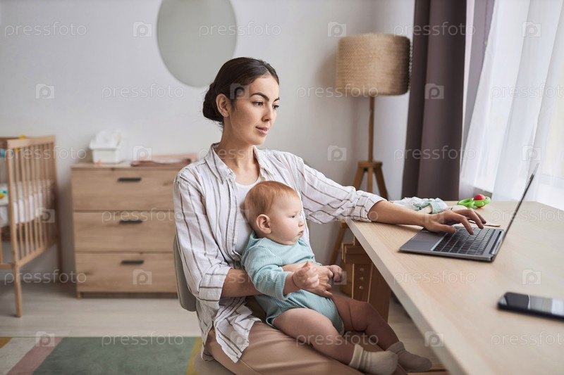 Молодая мать, работающая из дома и держащая ребенка