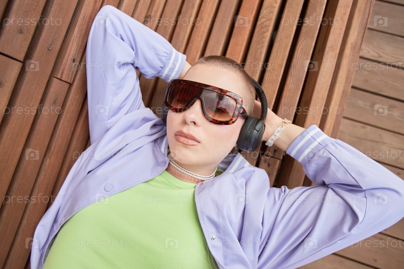 Вид сверху лысой молодой женщины в больших солнцезащитных очках, лежащей на скамейке в городе