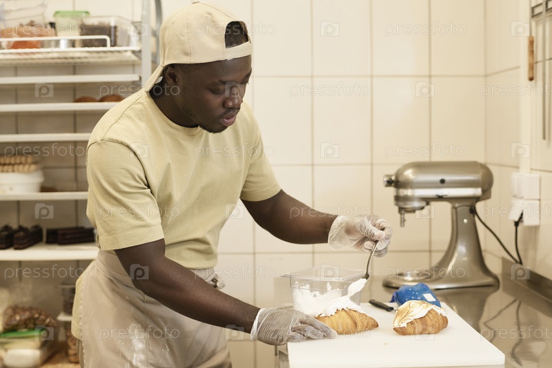 Молодой пекарь украшает свежие кроассанты сливком в ремесленной булочке