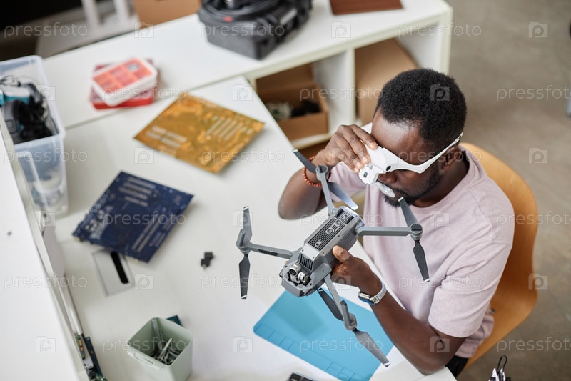 Чернокожий мужчина с увеличивающими очками осматривает беспилотник в ремонтной мастерской