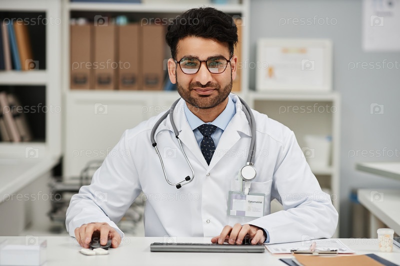 Портрет мусульманского врача, работающего на компьютере