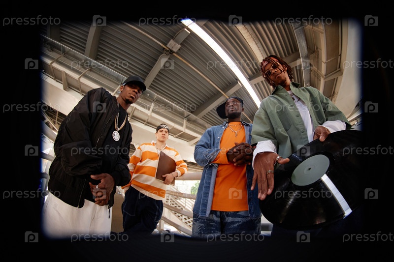 Юный хип-хоп исполнитель с виниловой пластинкой и остальной частью бойзбанда