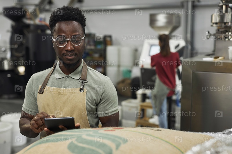 Человек, держащий планшет во время проверки качества в кофейной производственной мастерской