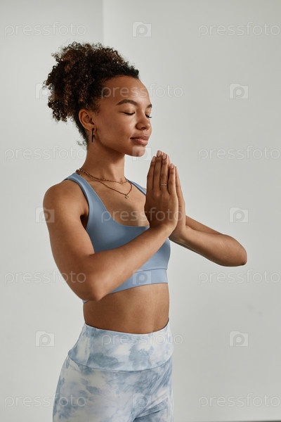 Афроамериканская женщина медитирует с закрытыми глазами в йога-студии