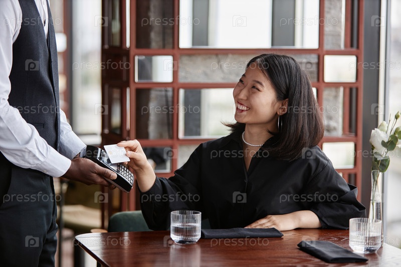 Улыбающаяся молодая женщина платит кредитной картой в роскошном ресторане