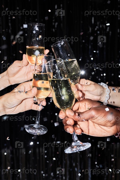 Группа друзей, приносящих тосты со стаканами шампанского на вечеринке