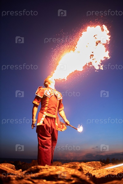 Человек, дышащий огонь, выступает на открытом воздухе