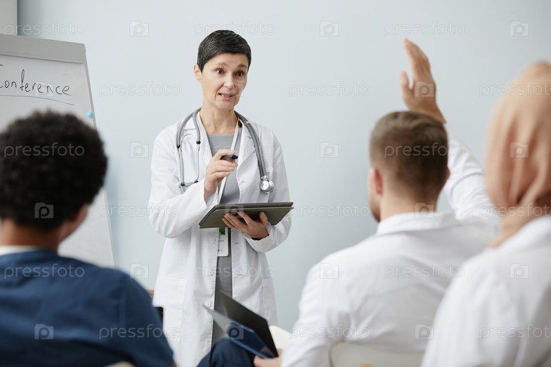 Портрет зрелой женщины-врача, выступающей перед аудиторией