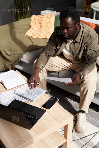 Чернокожий мужчина использует ноутбук, делая налоги и дом и рассчитывая бюджет