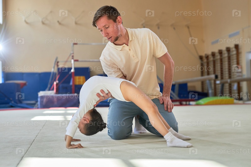 Инструктор поддерживает маленькую девочку гимнастка, занимающаяся мостом