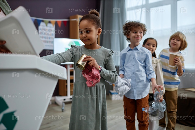 Черная девочка сортирует пластик на уроке переработки в дошкольном