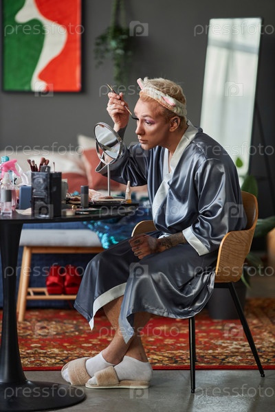 Молодой человек в роли драг-королевы делает макияж и смотрит в зеркало