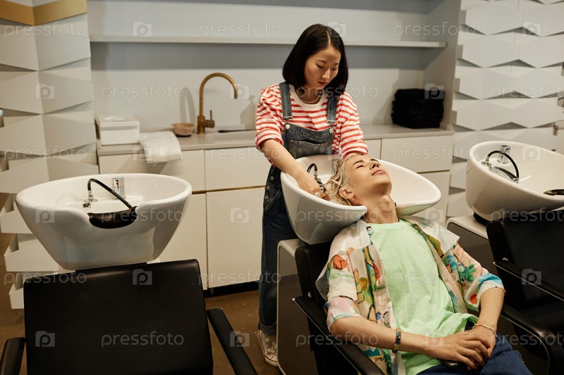 Молодой азиатский мужчина наслаждается уходом за волосами и мытьем в раковине салона красоты