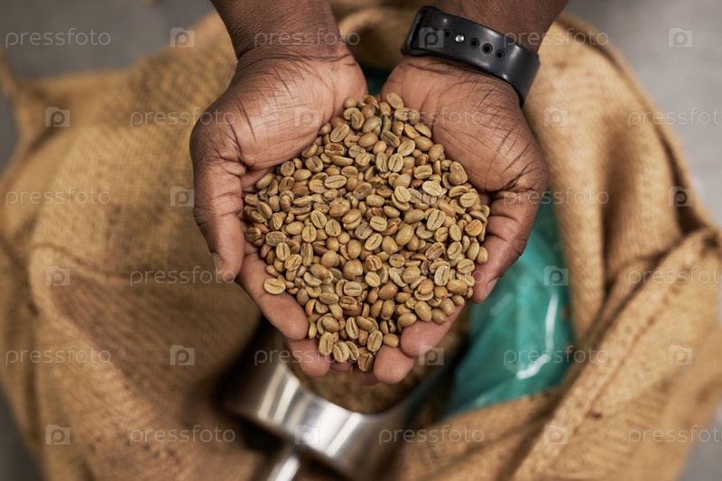 Top View Мужские руки, держащие свежие зеленые кофейные бобы