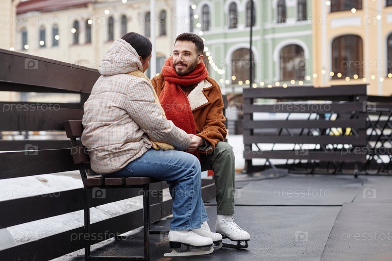 Романтическая молодая пара, держащаяся за руки на конькобежном катке вместе