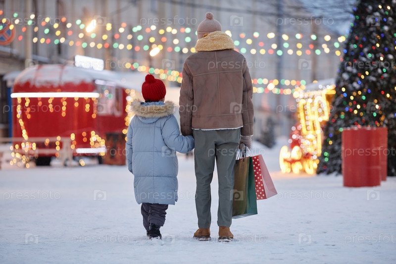 Обратный вид отца и ребенка, держащихся за руки, идущие в зимний парк