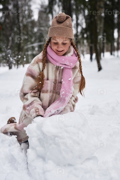 Милая улыбающаяся до-подростковая девочка в зимней одежде катится большим снежным шаром для снежного человека
