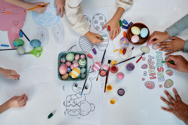Вид сверху детей, разрисовывающих пасхальные картины в дошкольном