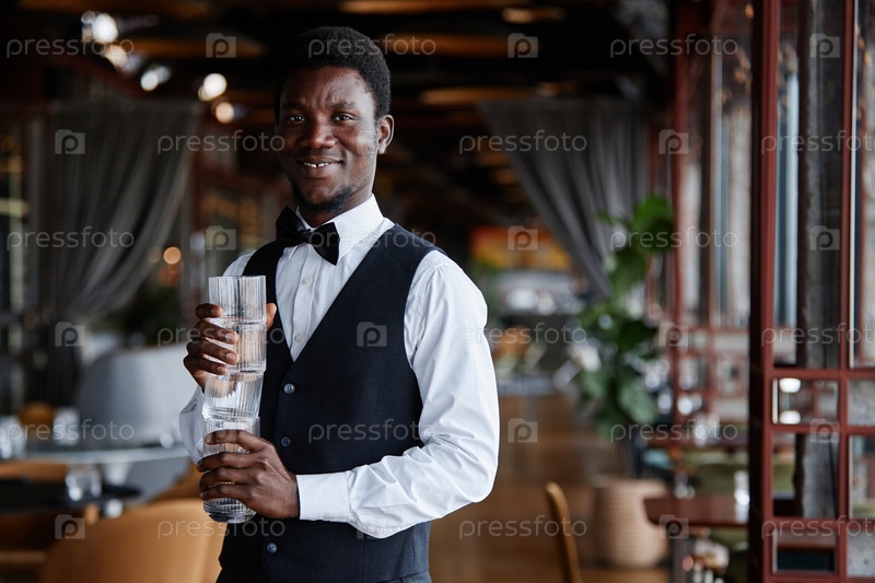 Молодой чернокожий мужчина, держащий очки и улыбающийся на камеру в ресторане