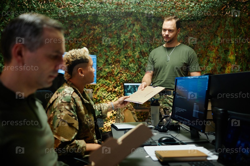 Молодой офицер-мужчина в футболке передает папку с секретными документами коллеге