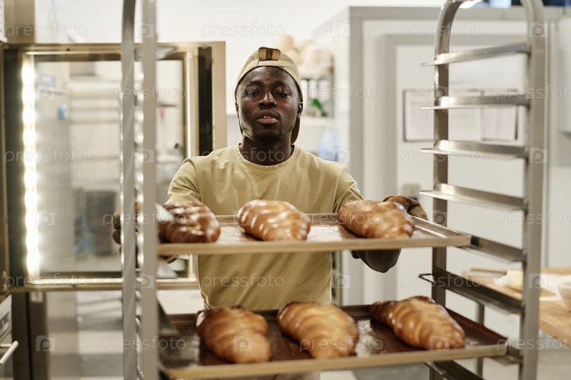 Чернокожий молодой человек кладет поднос с свежевыпеченным хлебом на кухне пекарни