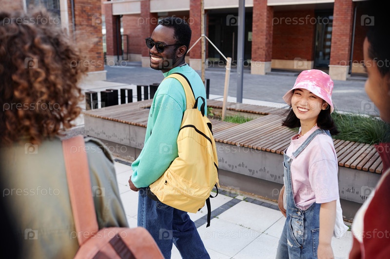 Разнообразная группа молодых студентов наслаждается днем в кампусе
