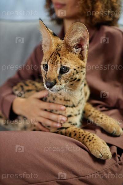 Кот Сервал сидит на коленях у девушки, отдыхающей на диване