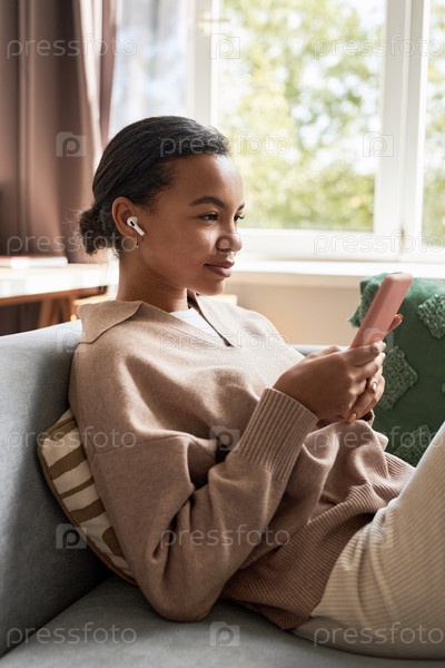 Молодая черная девушка, использующая смартфон с наушниками на уютном диване