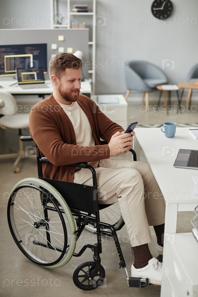 Высокоугольный мужчина с инвалидностью, использующий смартфон в офисе