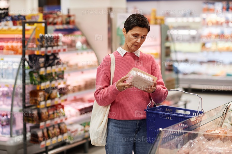 Женщина в супермаркете проверяет сроки годности на мясной упаковке