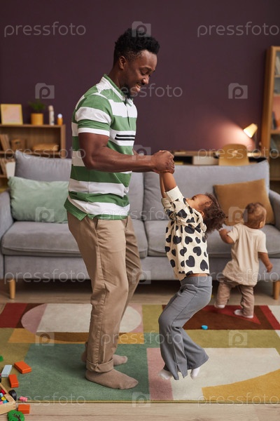 Счастливый чернокожий отец танцует со сладкой девочкой дома в гостиной