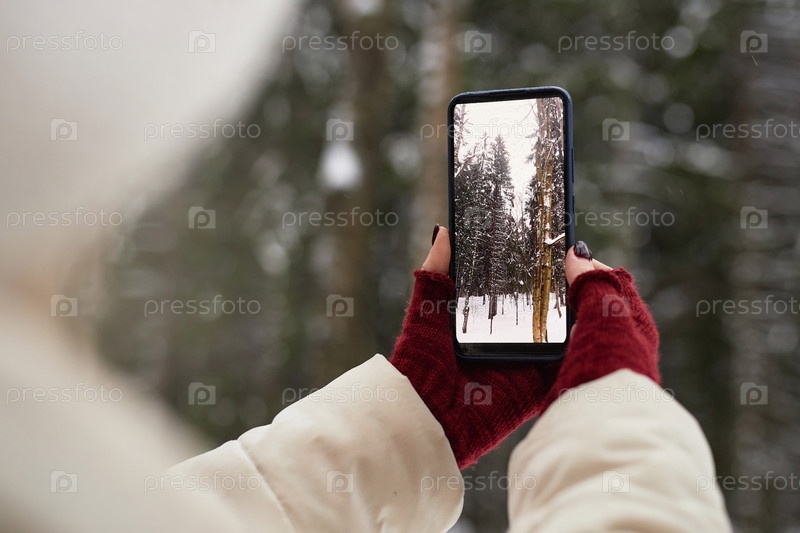 Сосредоточьтесь на смартфоне с зимним лесом на экране, который держит молодая женщина