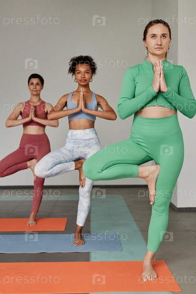 Три молодых женщины, держащие баланс в положении на дереве и йогу в студии