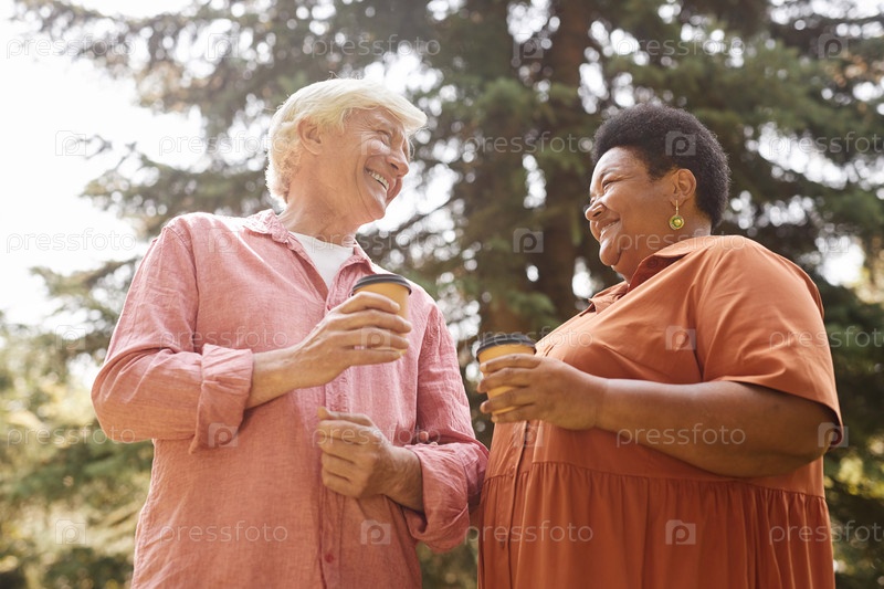 Низкий угол мультиэтническая старшая пара наслаждается свиданием на свежем воздухе и счастливо смеётся