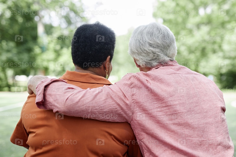 Задний вид романтической старшей пары, которая обнимается на свежем воздухе, наслаждаясь едой в парке