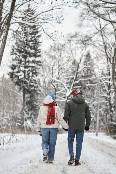 Вертикальный задний вид молодой пары, гуляющей по зимнему лесу