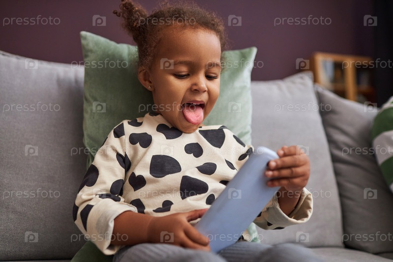 Любопытная девочка держит смартфон и играет в мобильные игры для детей