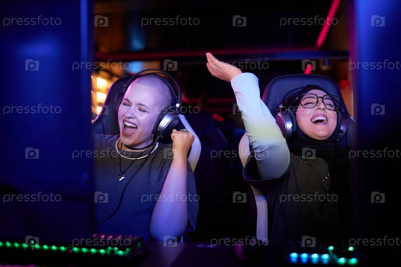 Две женщины играют в видеоигры и празднуют победу
