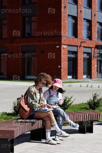 Две девушки как студентки на открытом воздухе в современном кампусе колледжа