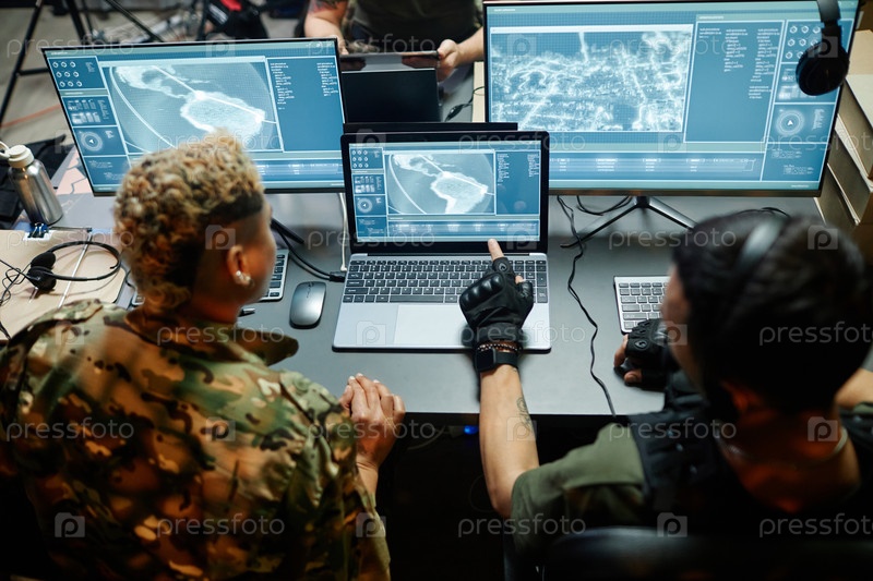 Задний вид двух молодых межкультурных офицеров-мужчин и женщин