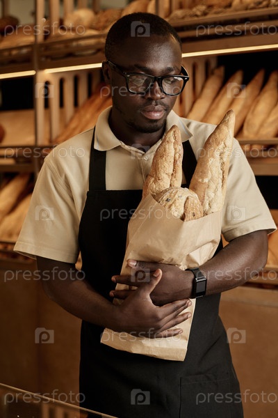 Молодой человек держит сумку со свежим хлебом в ремесленной пекарне