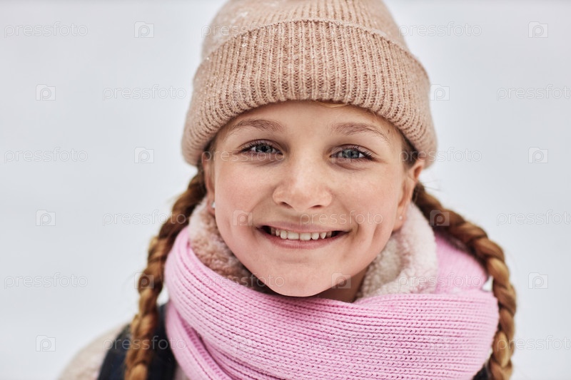 Веселая красивая девушка в теплой шерстяной зимней шапке и шарфе смотрит на камеру