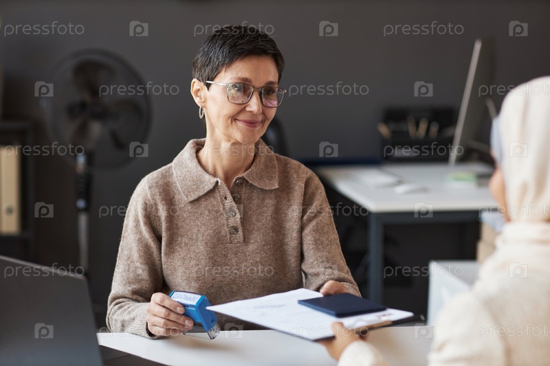 Счастливая зрелая женщина-менеджер центра подачи заявок на визу, проходящая документы